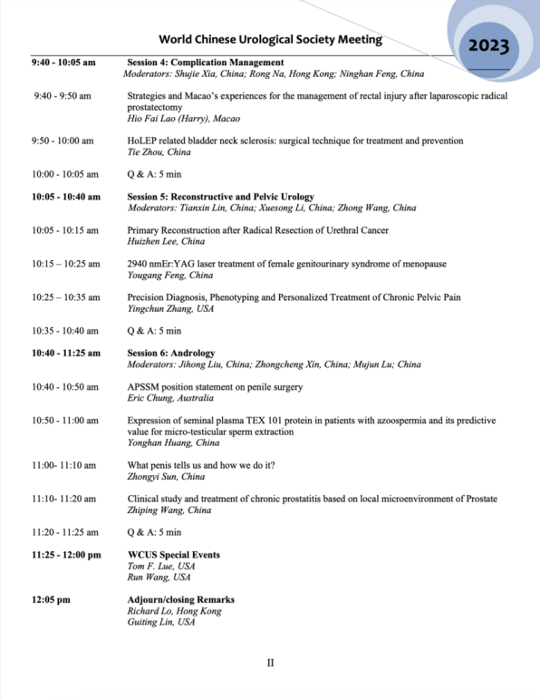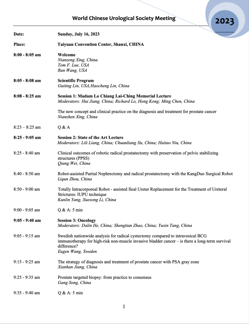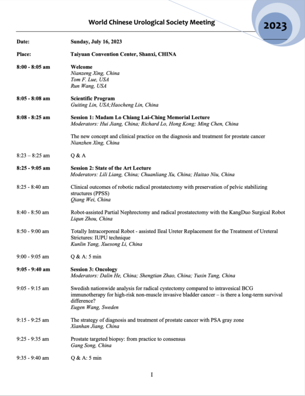 本次年会的议程由WCUS学术委员会制定,涵盖了泌尿外科的各个方面,特别聚焦全球华人泌尿外科领域的最新进展。演讲者和主持人都是由WCUS中各个区域协会选出,他们将代表各个协会中的最佳医师和科学家,为与会者带来精彩的演讲和讨论。