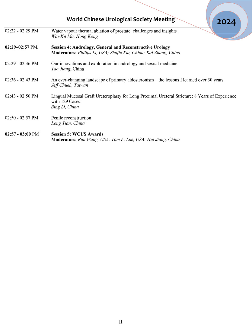 年会议程由WCUS学术委员会精心策划,涵盖多样化的泌尿学主题,特别关注中国泌尿学的最新突破。由区域性WCUS协会精心挑选的发言人和主持人确保高水平的演讲,为所有参与者提供动态的讨论和深刻的见解。
